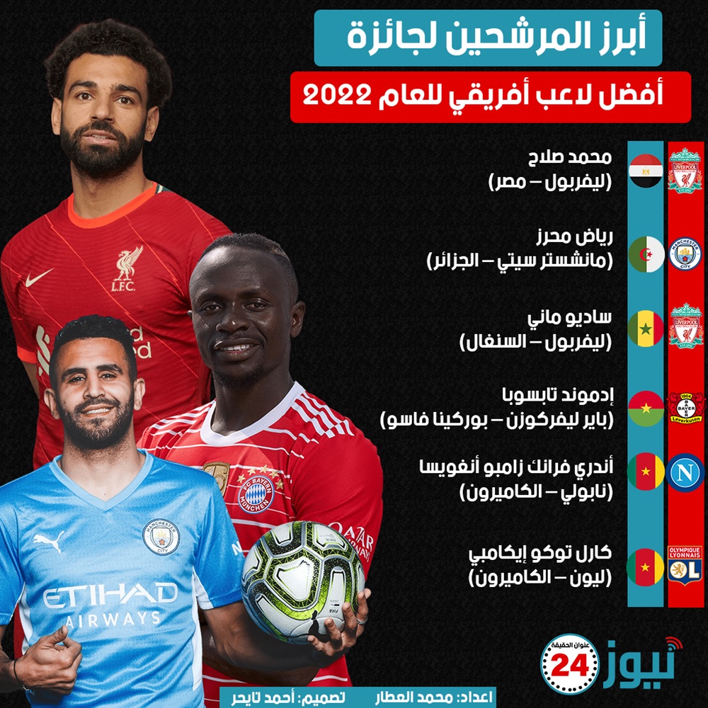 أبرز المرشحين لجائزة أفضل لاعب أفريقي للعام 2022.. "إنفوجراف" الخميس 30/يونيو/2022 - 08:34 م 6/30/2022 8:34:55 PM إعداد: محمد العطار - تصميم: أحمد تايجر كشف الاتحاد الأفريقي لكرة القدم ”كاف“، اليوم الخميس، قائمة المرشحين لجائزة أفضل لاعب أفريقي للعام 2022.