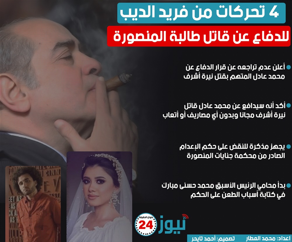 4 تحركات من فريد الديب للدفاع عن قاتل طالبة المنصورة.. "إنفوجراف" الخميس 07/يوليو/2022 - 05:27 م 7/7/2022 5:27:53 PM إعداد: محمد العطار - تصميم: أحمد تايجر ظهرت عدة تحركات من فريد الديب من أجل الدفاع عن محمد عادل قاتل طالبة المنصورة نيرة أشرف.