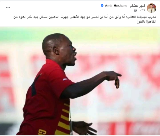 وكتب امير هشام عبر حسابه الشخصي علي موقع التواصل الاجتماعي "فيس بوك": "مدرب ميدياما الغاني: أنا واثق من أننا لن نخسر مواجهة الأهلي جهزت اللاعبين بشكل جيد لكي نعود من القاهرة بالفوز".