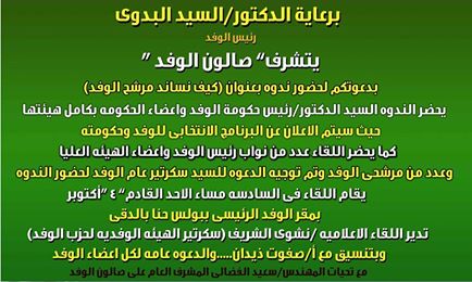 يعقد صالون حزب الوفد برعاية السيد البدوي رئيس الحزب، ندوة بعنوان "كيف نساند مرشح الوفد"، يوم الأحد القادم في السادسة مساء، بالمقر الرئيسي للحزب بحي الدقي، وذلك للإعلان عن البرنامج الانتخابي للوفد وحكومته.