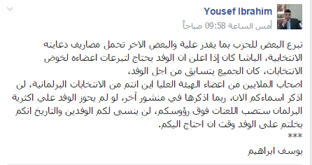 ووجه "إبراهيم" من خلال منشور له على موقع التواصل الاجتماعى "فيس بوك"، سؤالاً لأصحاب الملايين من أعضاء الهيئة العليا للحزب قائلاً؛ "أين أنتم من الانتخابات البرلمانية، لن اذكر اسماءكم الآن، ربما أذكرها في منشور آخر، ولو لم يحوز الوفد علي أكثرية البرلمان ستصب اللعنات فوق رؤوسكم، ولن ينسى لكم الوفدون والتاريخ أنكم بخلتم على الوفد وقت أن احتاج إليكم".