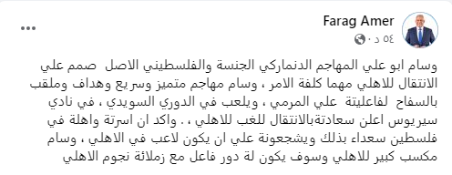 وكتب فرج عامر رئيس نادي سموحة عبر حسابه علي فيسبوك: "وسام ابو علي المهاجم الدنماركي الجنسة والفلسطيني الأصل مصمم علي الأنتقال للأهلي مهما كلفة الأمر، وسام مهاجم متميز وسريع وهداف وملقب بالسفاح لفاعليته علي المرمي، ويلعب في الدوري السويدي.