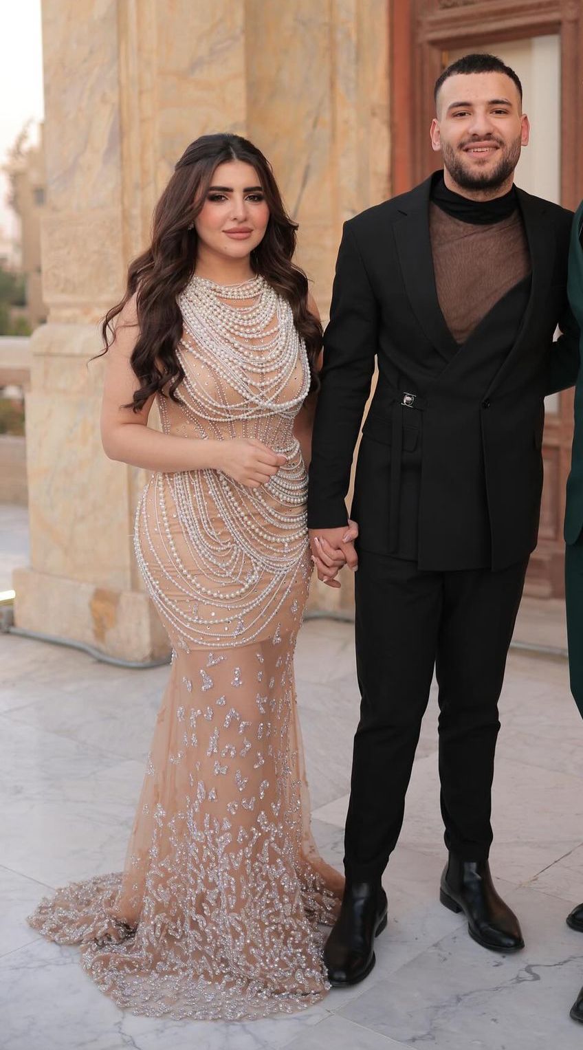 وتألقت العروس بفستان من الشيفون، باللون الجولد روز، مُطرز، مع الشعر الويفي المنسدل، بينما ظهر مسلم ببدلة سوداء كلاسيك، مع قميص شيفون أسود.