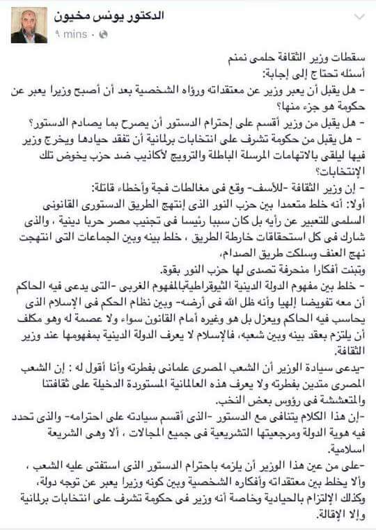 وطالب "مخيون"، من عين هذا الوزير أن يلزمه باحترام الدستور الذي استفتى عليه الشعب ، وألا يخلط بين معتقداته وأفكاره الشخصية وبين كونه وزيرا يعبر عن توجه دولة، وكذلك اﻹلتزام بالحيادية خاصة أنه وزير في حكومة تشرف على انتخابات برلمانية وإلا اﻹقالة.