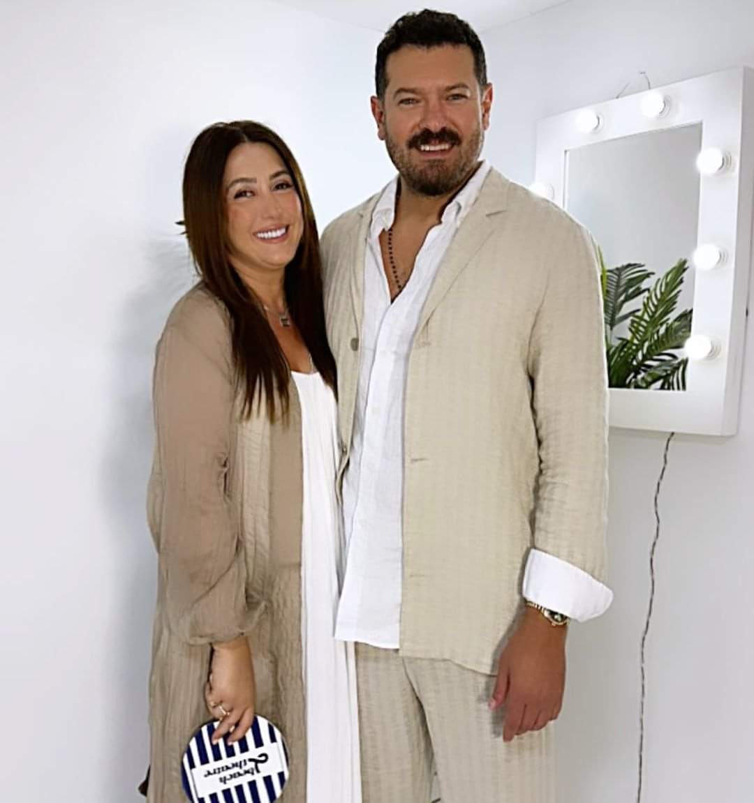 وأطلت كندة علوش بإطلالة أنيقة تبرز جمالها، مرتدية توب باللون الأبيض مع كاردجيان كاجوال باللون البيج بشكل فضفاض وواسع، فيما ارتدى عمرو يوسف نفس الالوان ولكن عبارة عن قميص وتي شيرت وبنطلون.