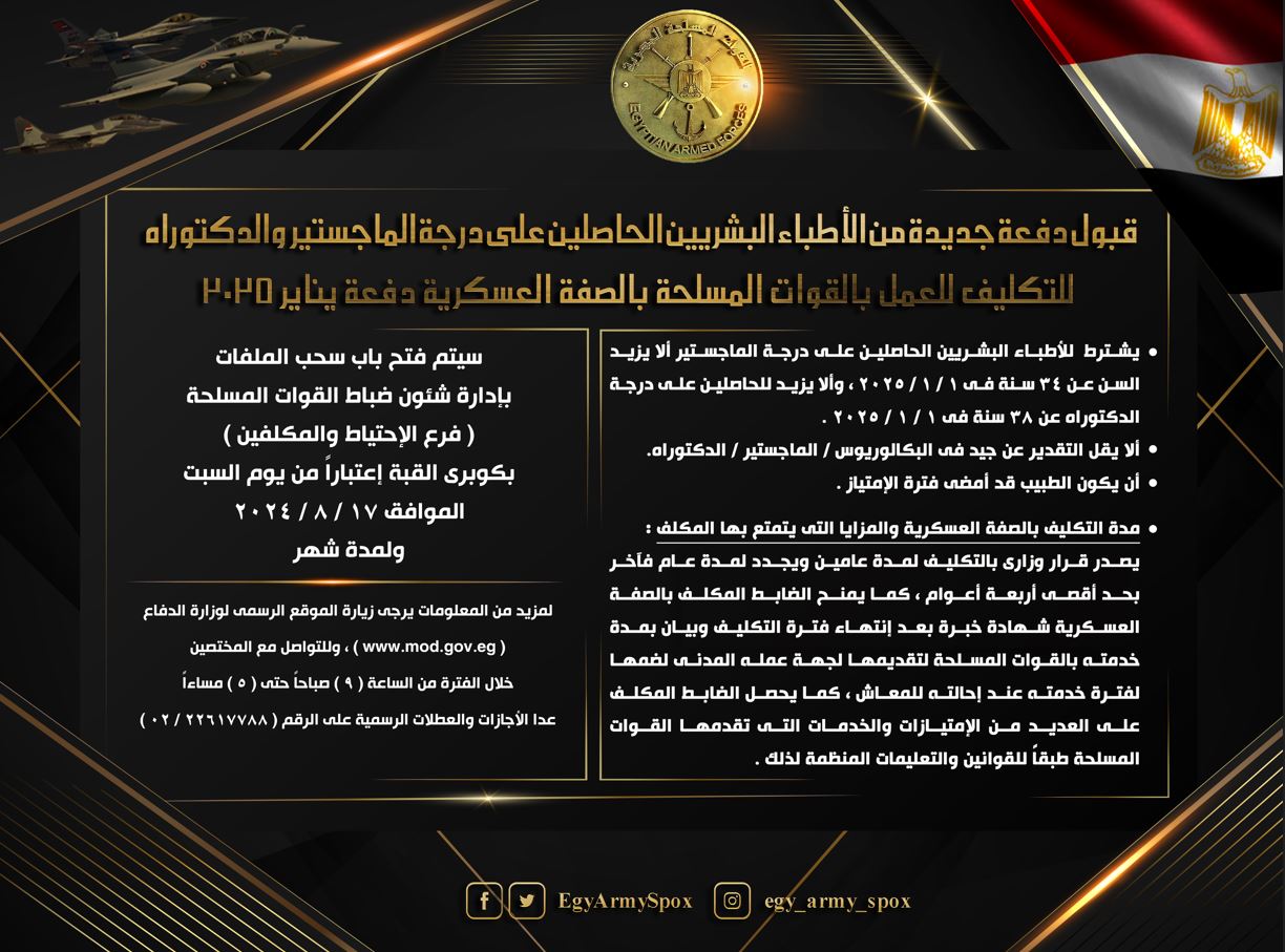 صدق الفريق أول عبدالمجيد صقر القائد العام للقوات المسلحة وزير الدفاع والإنتاج الحربى على الإعلان عن قبول دفعة جديدة من الأطباء البشريين الحاصلين على درجة الماجستير / الدكتوراه للعمل كضباط مكلفين بالقوات المسلحة بالصفة العسكرية دفعة يناير 2025 .