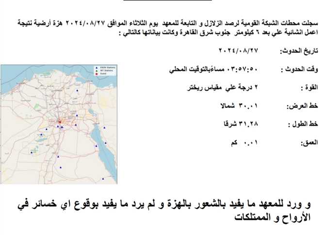 وأوضح المعهد، في بيان صدر عنه، أنّ وقت حدوث الهزة كان في الساعة 3:57:50 مساءً بالتوقيت المحلي، وكانت بقوة 2 درجة على مقياس ريختر على خط عرض 30.01 شمالا، وخط طول 31.28 شرقاً وعمق 0.01 كم.