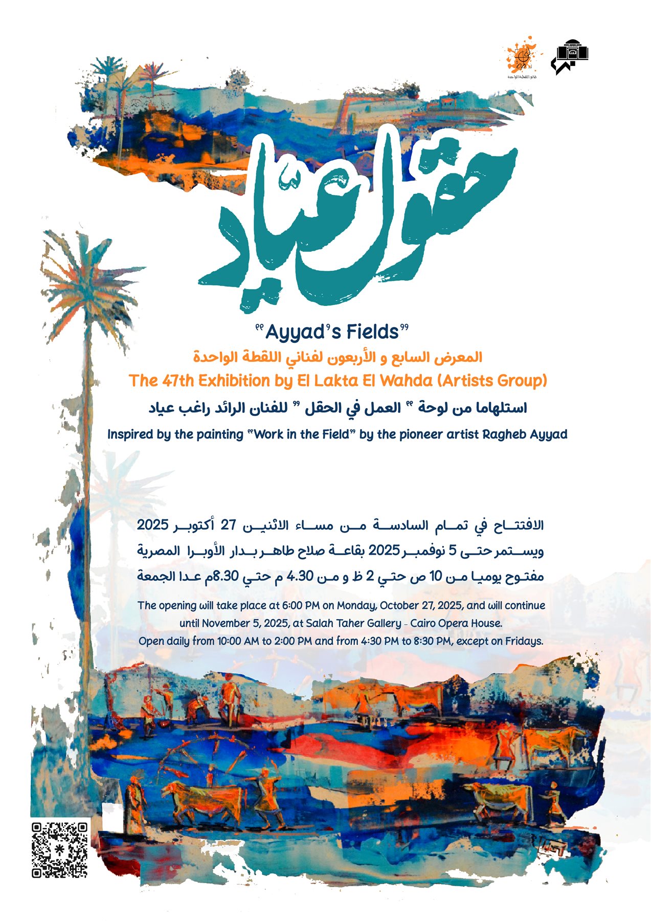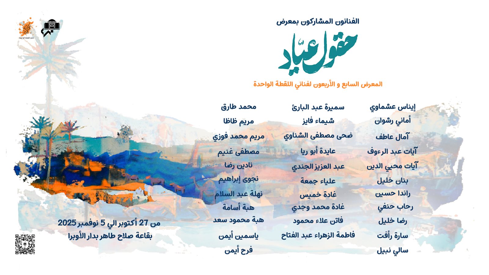 يتشرف فنانو اللقطة الواحدة بدعوتكم لافتتاح معرضهم السابع والأربعين بعنوان "حقول عياد" وذلك في تمام السادسة من مساء الاثنين الموافق ٢٧ أكتوبر ٢٠٢٥ بقاعة الفنان صلاح طاهر بدار الأوبرا المصرية.