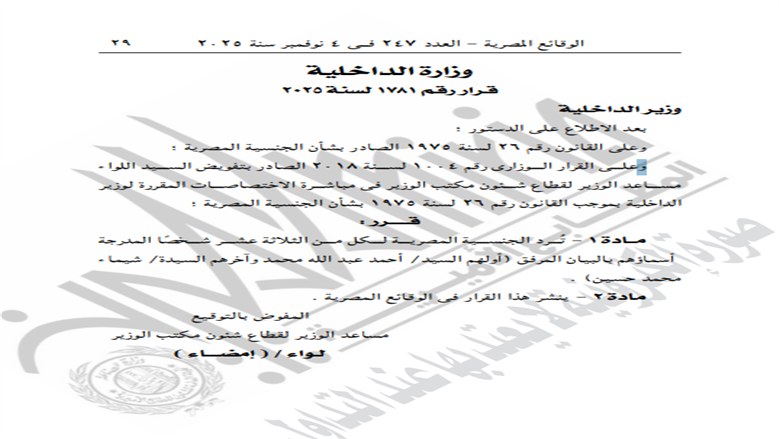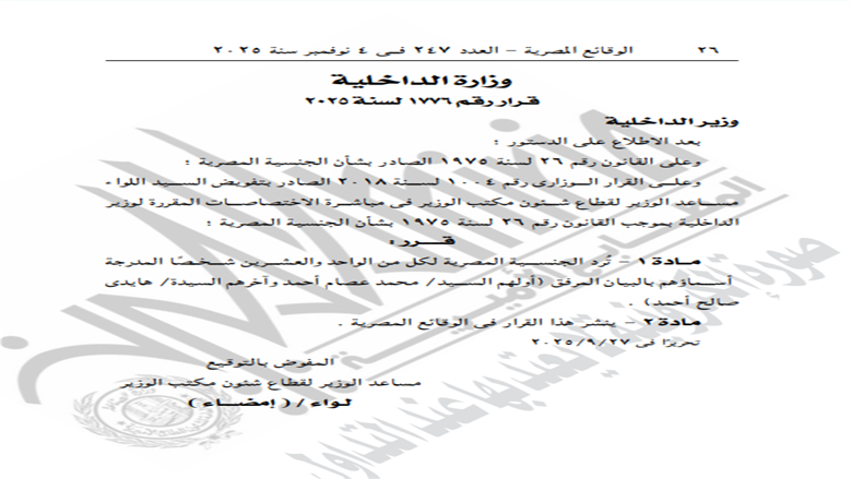 نشرت جريدة الوقائع المصرية، قرار وزارة الداخلية رقم 1776 لسنة 2025، بشأن رد الجنسية المصرية لـ34 مواطنًا، وذلك في العدد 247 في 4 نوفمبر 2025.