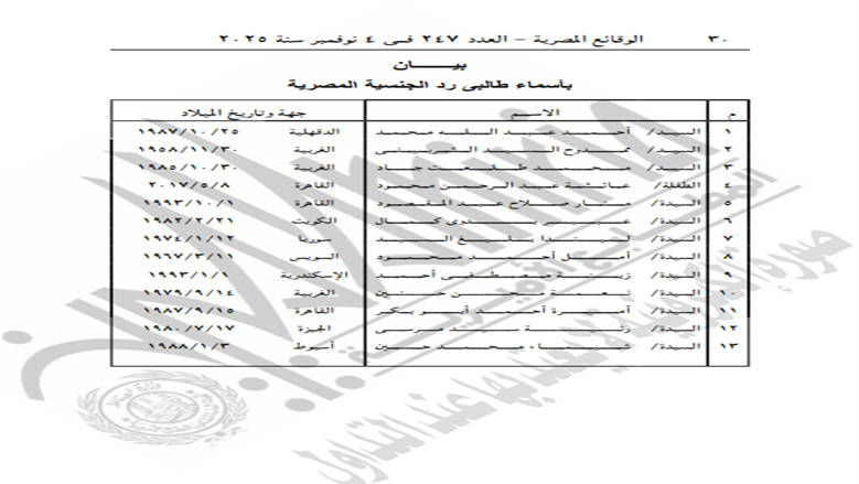 وجاء أيضًا في المادة الأولى من القرار رقم 1781 لسنة 2025، تُرد الجنسية المصرية لكل من الثلاثة عشر شخصًا المدرجة أسماؤهم بالبيان المرفق أولهم أحمد عبدالله محمد وآخرهم شيماء محمد حسين.