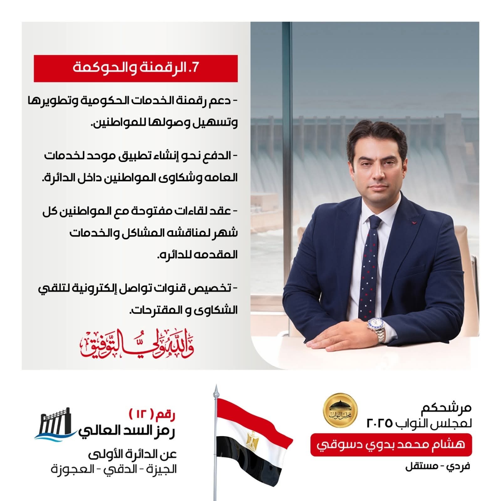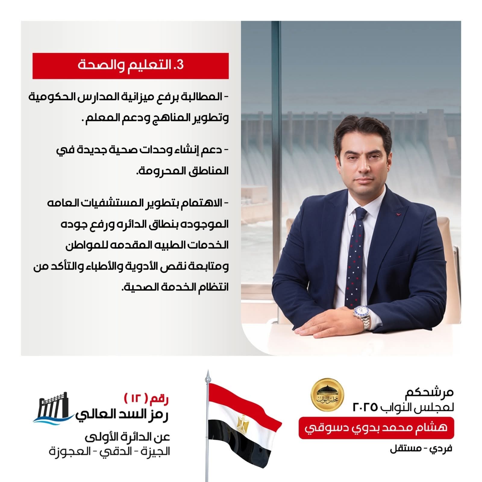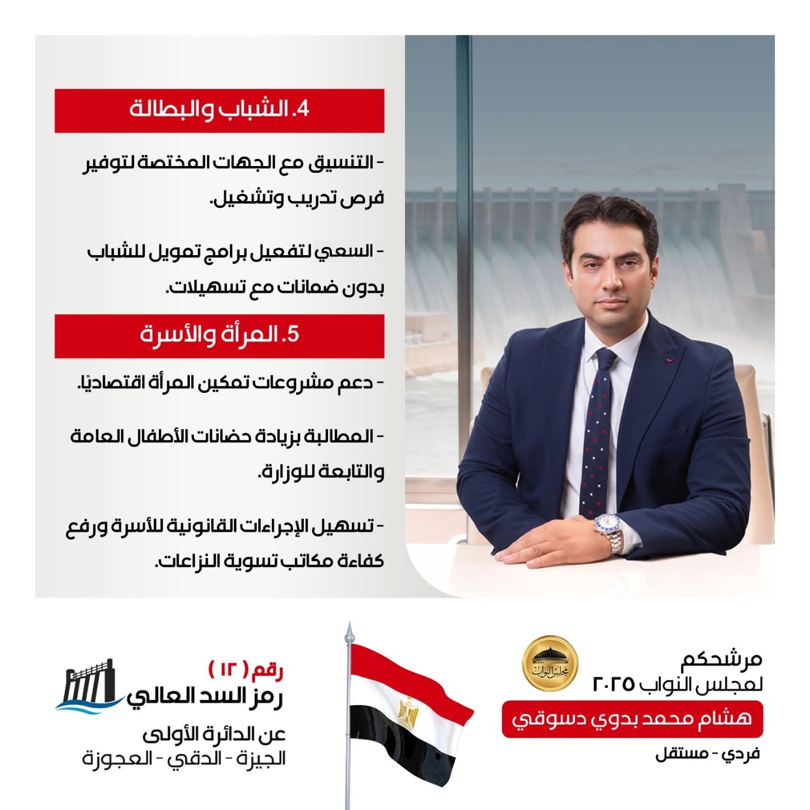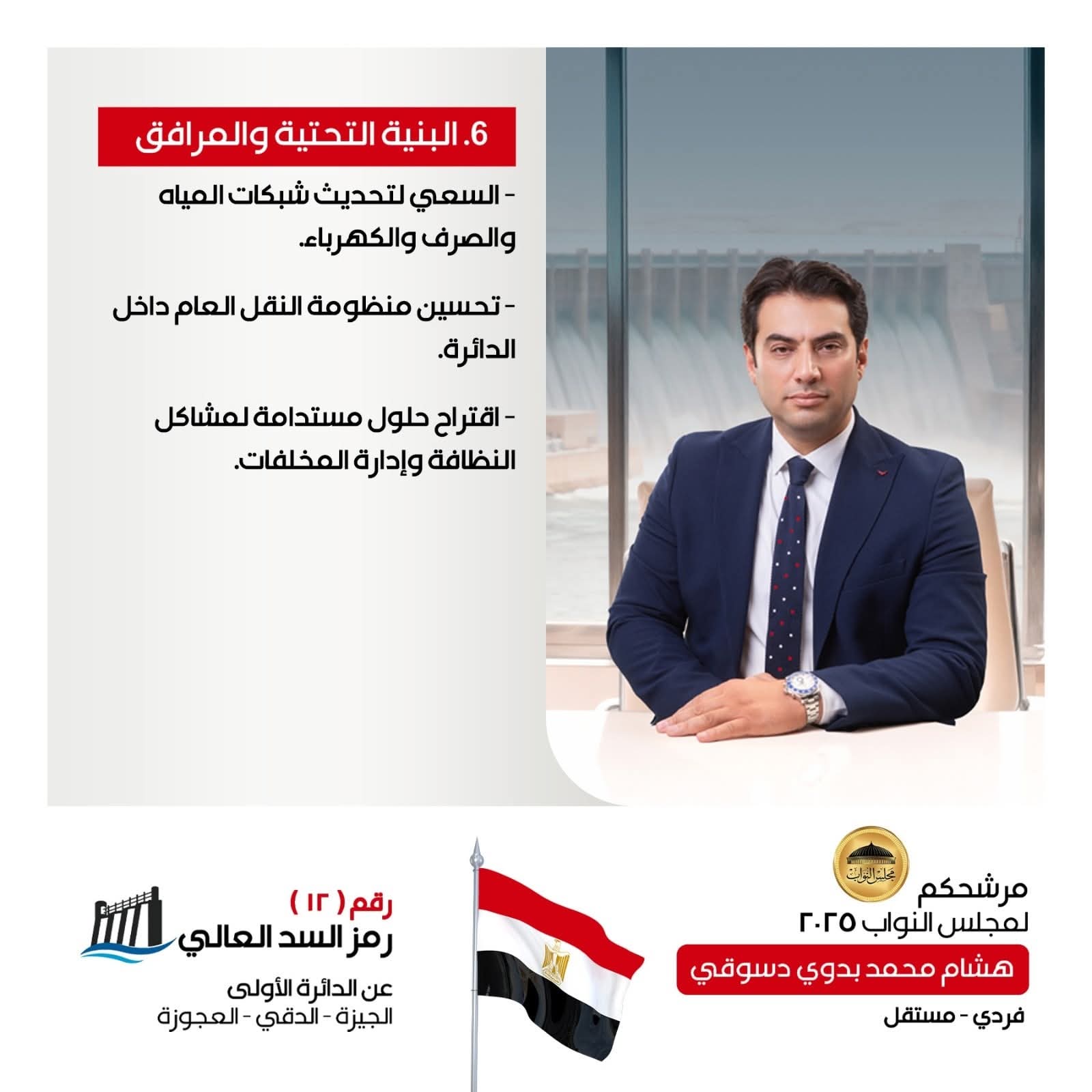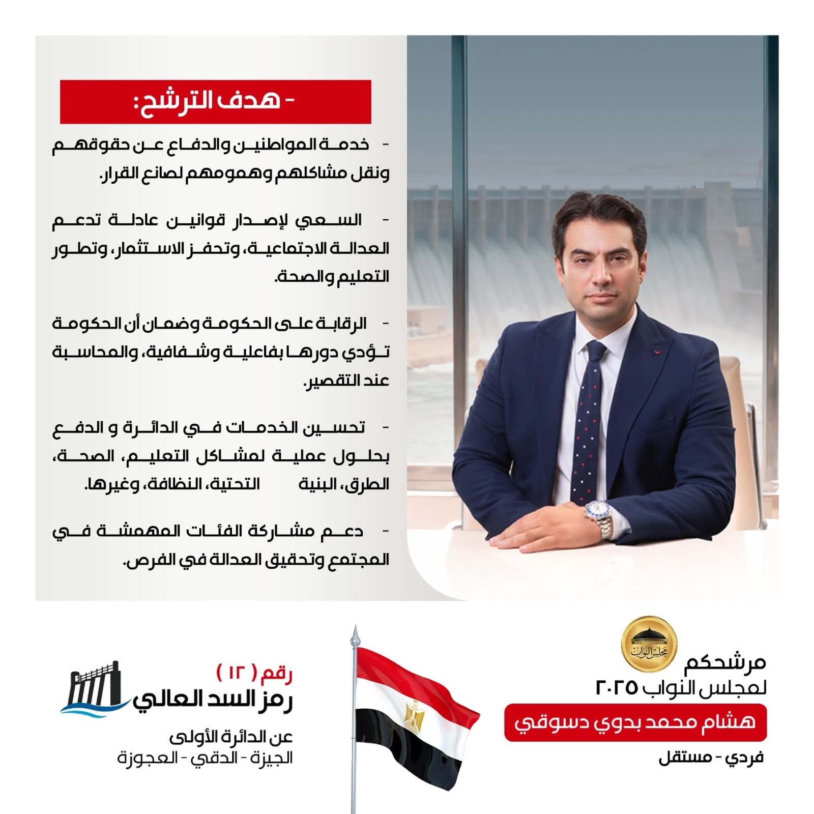 وفي هذا الإطار، يؤكد المرشّح هشام محمد بدوي دسوقي على أهمية مجلس النواب القادم في دعم خطط الدولة التنموية، وتعزيز منظومة الرقابة البرلمانية بما يخدم المصلحة العامة للمواطنين.