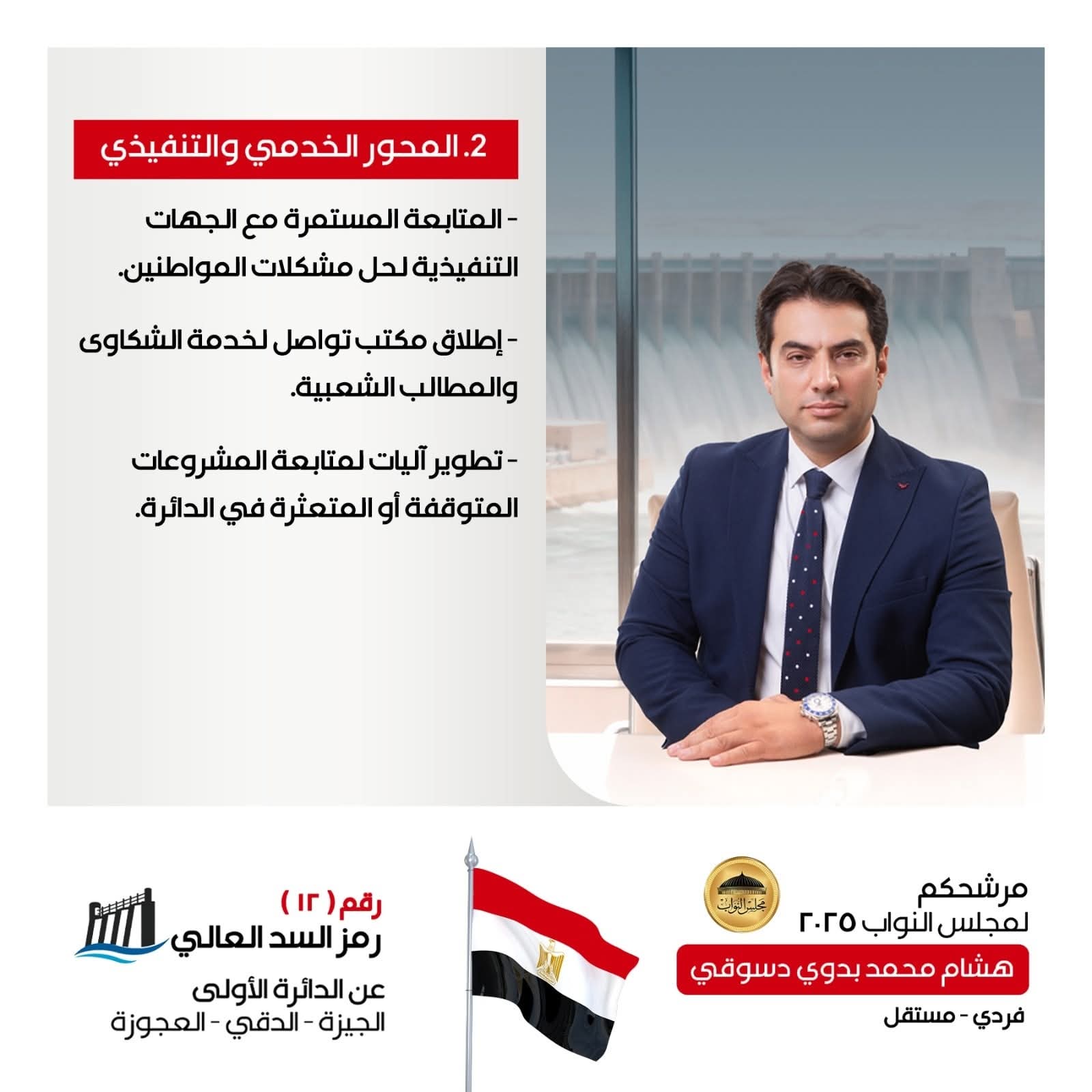 يؤكد هشام محمد بدوي دسوقي أن خدمته للدائرة ستكون قائمة على الشفافية والعمل الميداني، موضحاً أن هدفه هو أن يصبح صوت المواطنين داخل المجلس، والعمل على إيجاد حلول عملية لمشكلات المناطق المختلفة بالدائرة، بالتعاون مع الأجهزة التنفيذية والمجتمع المدني.