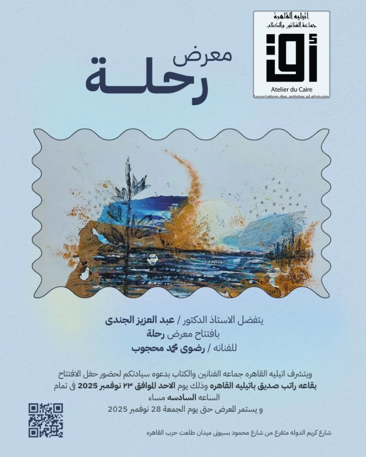 يفتتح الدكتور عبد العزيز الجندي مساء اليوم الأحد ٢٣ نوفمبر ٢٠٢٥ معرض "رحلة" للفنانة رضوى محمد محجوب، وذلك في قاعة راتب صديق بأتيليه القاهرة – جماعة الفنانين والكتاب