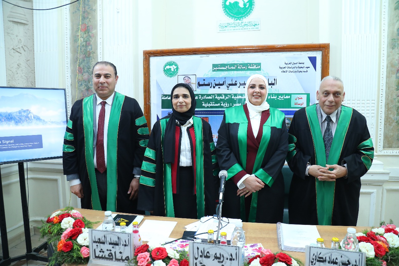 ولجنة المناقشة ترأسها الدكتور حسن عماد مكاوي، أستاذ الإذاعة والتليفزيون والعميد الأسبق لكلية الإعلام جامعة القاهرة، وعضوية الدكتورة ريم أحمد عادل أستاذ العلاقات العامة والإعلان بكلية الإعلام جامعة القاهرة ورئيس قسم بحوث ودراسات الإعلام بالمعهد، والدكتور السيد السعيد عبدالوهاب أستاذ ورئيس قسم الاتصال التسويقي المتكامل بكلية الإعلام جامعة المنوفية.