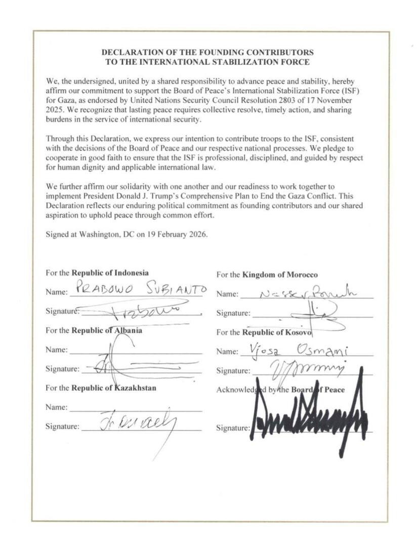 وجاء في نص الوثيقة: "نحن، الموقعون أدناه، وإذ يجمعنا إحساس مشترك بالمسئولية تجاه دفع مساعي السلام والاستقرار قدما، نعلن بموجب هذا التزامنا بدعم قوة التثبيت الدولية لغزة، التابعة لمجلس السلام، وذلك على النحو الذي أقره قرار مجلس الأمن التابع للأمم المتحدة رقم 2803 الصادر في السابع عشر من نوفمبر 2025. ونحن إذ ندرك تماما أن تحقيق السلام الدائم يتطلب إرادة جماعية، وعملا في الوقت المناسب، وتقاسما عادلا للأعباء في سبيل خدمة الأمن الدولي".