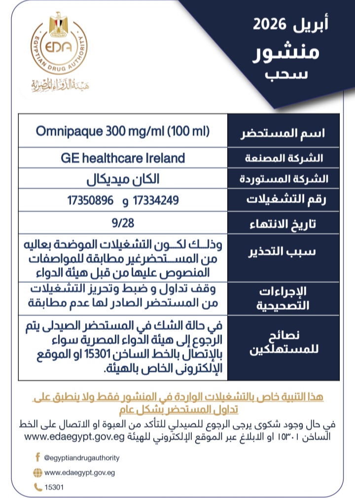 أصدرت هيئة الدواء المصرية منشور سحب خلال شهر أبريل 2026، يخص مستحضر Omnipaque 300 mg/ml (100 ml)، وذلك لعدم مطابقة بعض التشغيلات للمواصفات القياسية المعتمدة.