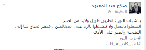 وقال عبدالمعبود فى تدوينة له على موقع التواصل الاجتماعى "فيس بوك"، "يا شباب النور الطريق طويل وﻻبد من الصبر، وانشغلوا بالعمل وﻻ تنشغلوا بالرد على المخالفين، فمصر تحتاج منا إلى التضحية والصبر على اﻷذى".