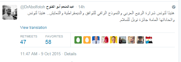 وقال أبو الفتوح فى تدوينة له على موقع التواصل الاجتماعى "تويتر"، "هنيئا لتونس شرارة الربيع العربي والنموذج الراقي للتوافق والديمقراطية والتعايش.. هنيئا لتونس واتحاداتها العامة جائزة نوبل للسلام".