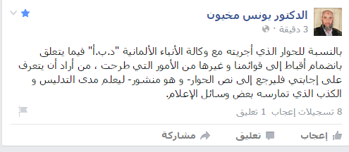 وقال مخيون في تدوينة له على موقع التواصل الاجتماعي "فيس بوك": "بالنسبة للحوار الذي أجريته مع وكالة الأنباء الألمانية "د.ب.أ"، فيما يتعلق بانضمام أقباط إلى قوائمنا وغيرها من الأمور التي طرحت، من أراد أن يتعرف على إجابتي فليرجع إلى نص الحوار- وهو منشور- ليعلم مدى التدليس والكذب الذي تمارسه بعض وسائل الإعلام".
