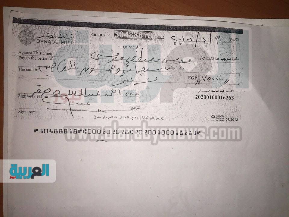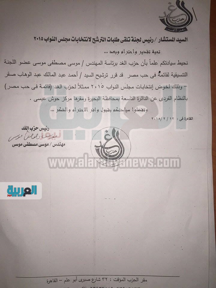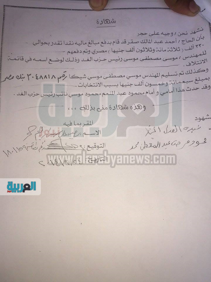 حصلت "العربية نيوز" من مصادرها الخاصة على مستندات تثبت طلب رئيس حزب الغد موسى مصطفى موسى تلقي مبلغ مالي وقدره 750 ألف جنيه ، من أحد المرشحين ويُدعى أحمد عبدالمالك عبدالوهاب صقر مقابل الترشح بقائمة "في حب مصر"، وذلك في الانتخابات التي تم تأجيلها في العام الجاري.