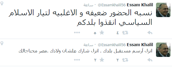 وقال خليل، في تغريدة له علي موقع التدوين العالمي "تويتر"، "نسبه الحضور ضعيفة و الأغلبية لتيار الإسلام السياسي.. انقذوا بلدكم".