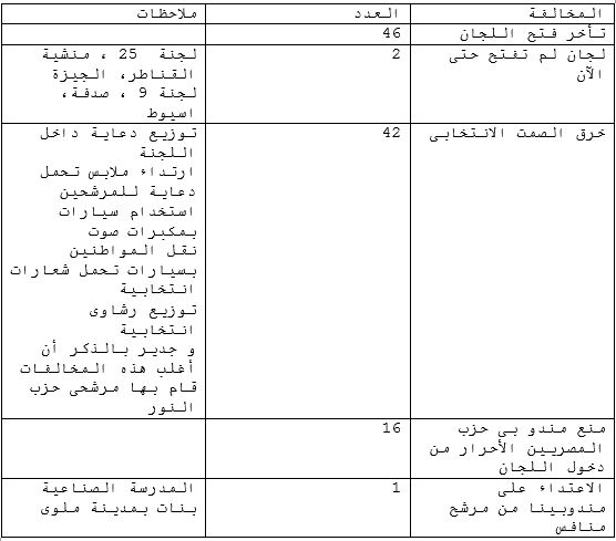 ولم تخل العملية الانتخابية من بعض التجاوزات التي شابت عددا من اللجان أغلبها يتعلق بتأخر حضور القضاة مسئولي لجان فرعية، مما أدى لفتح باب الاقتراع في مواعيد متأخرة عن المقرر لها رسميًا، بالإضافة إلى انتهاك عدد من المرشحين للقانون وخرق الصمت الأاتخابى، ورصد عدد من محالاوت منع مندوبينا من متابعة سير العملية الانتخابية بعدة لجان.
